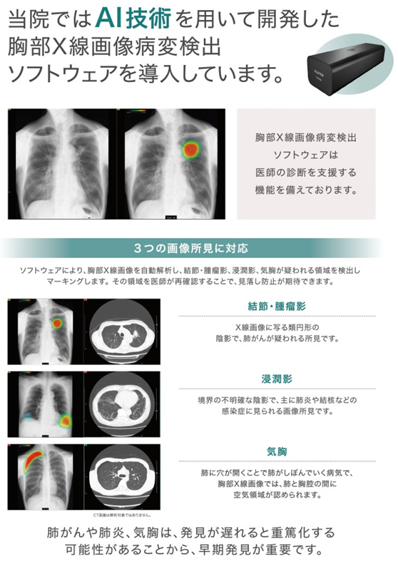 当院では、胸部レントゲン検査の診断精度向上と早期発見・早期治療を目的として、富士フイルム社製のAI診断支援ソフト「CXR-AID」を2026年3月20日より導入しました。